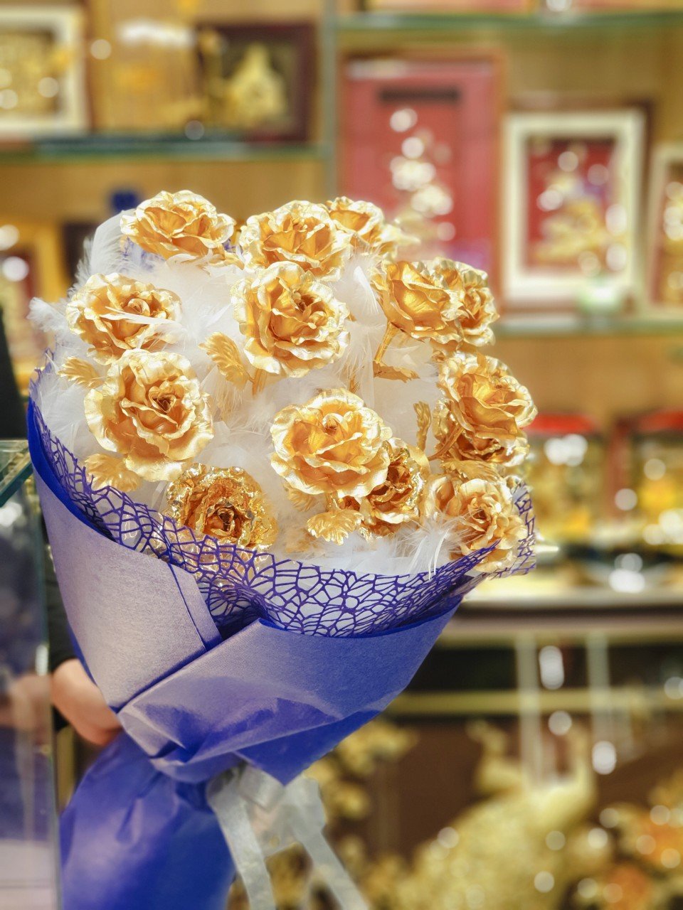 Nếu bạn muốn món quà sang trọng hơn hoa khô nhân ngày đặc biệt của cô ấy, thì một bó hoa hồng dát vàng 24k cũng là sự lựa chọn thông minh. Hoa hồng tượng trưng cho tình yê đôi lứa, mà còn là hoa dát vàng nữa thì tình cảm càng thêm bền chặt, vĩnh cửu. Hoa hồng dát vàng là vật phẩm trưng bày lâu dài mà không bao giờ tàn úa. Nếu anh ấy tặng bạn hoa hồng dát vàng cao cấp này, chứng tỏ anh ấy yê bạn rất nhiều.