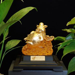 Tượng heo dát vàng 24k là sản phẩm quà tết độc đáo, sang trọng, ý nghĩa. Với hình ảnh chú lợn đang thong dong đi trên đống tiền là biểu trưng cho một năm mới nhiều tiền tài, may mắn, cuộc sống an nhiên. Chú heo là biểu tượng của tuổi hợi và được gọi là con lợn vàng mang đến may mắn, tài lộc. Tượng heo dát vàng 24k là món quà tết sang trọng, ý nghĩa tặng khách hàng, bố mẹ.