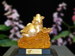 Tượng heo dát vàng 24k là sản phẩm quà tết độc đáo, sang trọng, ý nghĩa. Với hình ảnh chú lợn đang thong dong đi trên đống tiền là biểu trưng cho một năm mới nhiều tiền tài, may mắn, cuộc sống an nhiên. Chú heo là biểu tượng của tuổi hợi và được gọi là con lợn vàng mang đến may mắn, tài lộc. Tượng heo dát vàng 24k là món quà tết sang trọng, ý nghĩa tặng khách hàng, bố mẹ.