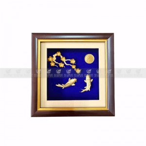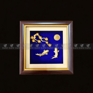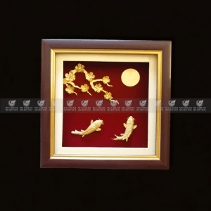 Tranh cá chép hoa mai dát vàng với hai hình ảnh chủ đạo là đôi cá chép vàng song hành cùng nhau, hướng về phía cành mai đang khai hoa, thích hợp làm quà tặng khách hàng dịp tết.