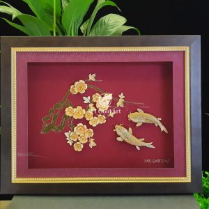 Tranh cá chép hoa mai dát vàng với hai hình ảnh chủ đạo là đôi cá chép vàng song hành cùng nhau, hướng về phía cành mai đang khai hoa.