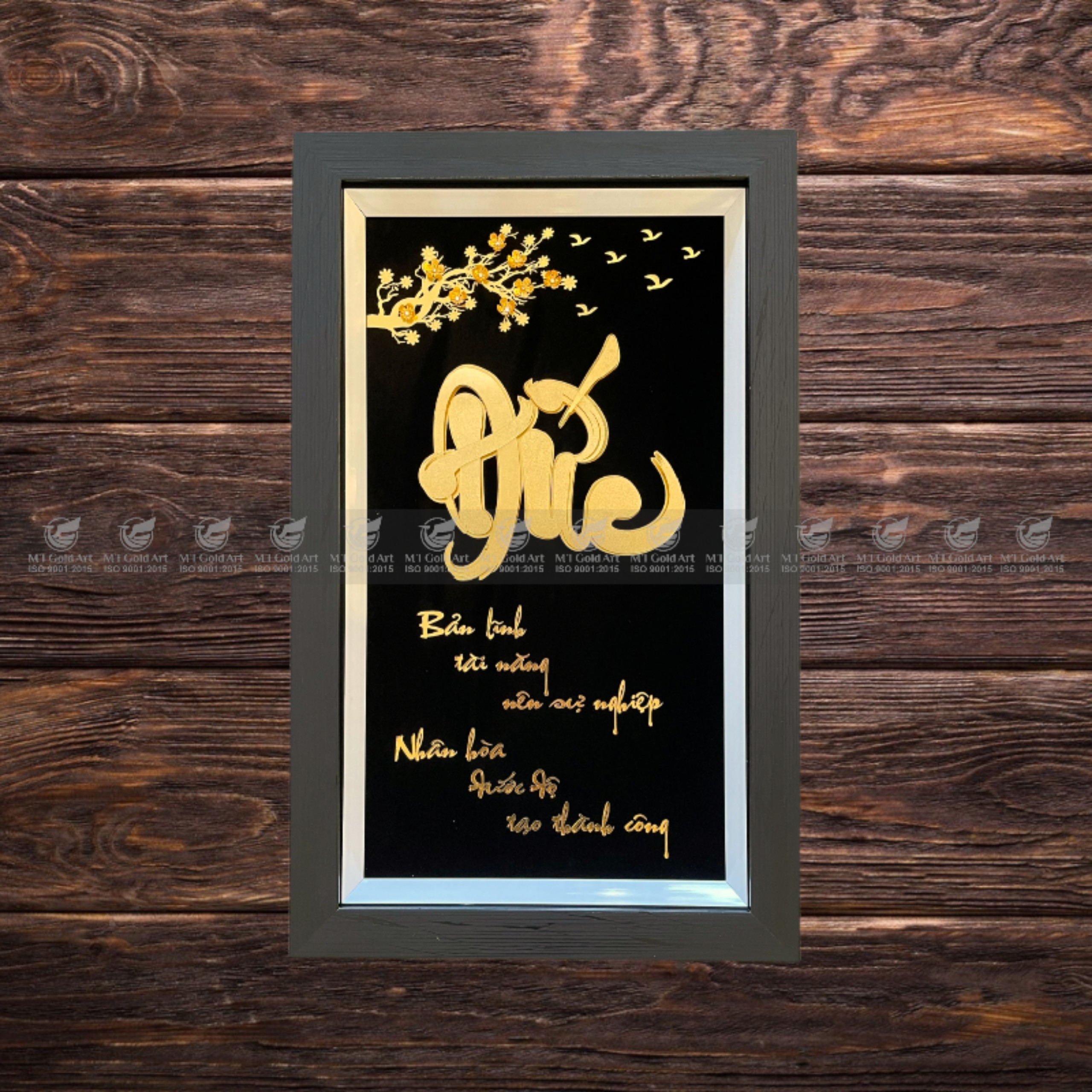 Bức tranh lấy chữ Đức làm trọng tâm nhưng lại thể hiện bài thơ bằng những đường nét bay lượn, tạo nên sự uyển chuyển, tinh tế cho người nhìn. Để đánh giá một bức tranh người ta phải ngắm hồi lâu, quan sát từng đường nét một, từng góc cạnh mới thấy được vẻ đẹp tiềm ẩn bên trong nó. Bằng đôi bàn tay khéo léo với bề dày kinh nghiệm lâu năm kết hợp với kĩ thuật nghệ thuật hiện đại các nghệ nhân MT GOLD ART đã thể hiên sinh động những dòng thơ hay ý nghĩa:
