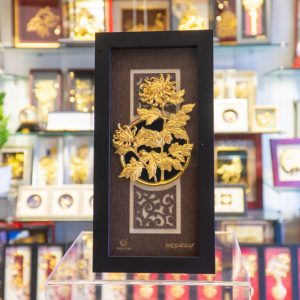 Tranh hoa Cúc mạ vàng với màu vàng tươi rực rỡ chính là điểm nhấn giúp cho không gian thêm bừng sáng, rực rỡ. Bức tranh được làm bằng những người thợ lâu năm và có kinh nghiệm lâu năm trong nghề chế tác kim hoàn. Do đó, bất cứ ai khi chạm mắt với tranh hoa Cúc vàng đều không khỏi ngạc nhiên vì độ tinh xảo, tinh tế của sản phẩm. Toàn bộ bông hoa đều được chế tác từ 100% vàng lá 24k nguyên chất. .