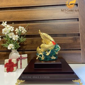 Tượng cá rồng mạ vàng được chế tác thủ công với quá trình gia công tỉ mỉ, khắc họa dáng dữ dằn của chú cá mang dáng dấp đế vương. Sản phẩm được chế tác thủ công vô cùng tinh xảo từ đồng, bề mặt mạ vàng 24K sang trọng, cao cấp. Từng chi tiết từ vây cá, vẩy cá, đuôi, mắt,… đều được tạc sống động, uyển chuyển như thật. Các lớp vây cá cũng được các nghệ nhân truyền thống tạo mẫu chi tiết, tạo thành tầng tầng lớp lớp giống như các chuỗi tiền vàng xếp chồng lên nhau. Các nghệ nhân MT GOLD ART lên ý tưởng thiết kế và chế tác sản phẩm tượng cá rồng mạ vàng dưới sự tư vấn giám sát chặt chẽ của các chuyên gia phong thủy. Mình cá với một thân hình khỏe khoắn thể hiện sức mạnh của người quân tử cưỡi sóng lướt đi như mượn sức mạnh của tự nhiên mà tiến về phía trước. Nó hướng lên với ý nghĩa thăng tiến trên con đường công danh. Linh vật cá nằm trên sóng nước hết sức uyển chuyển và nhẹ nhàng. Cả bức tượng được đặt trên một giá đỡ bằng gỗ óc chó cao cấp có màu tối giúp làm nổi bật hơn màu vàng kim của chất liệu vàng ròng phủ bên ngoài.